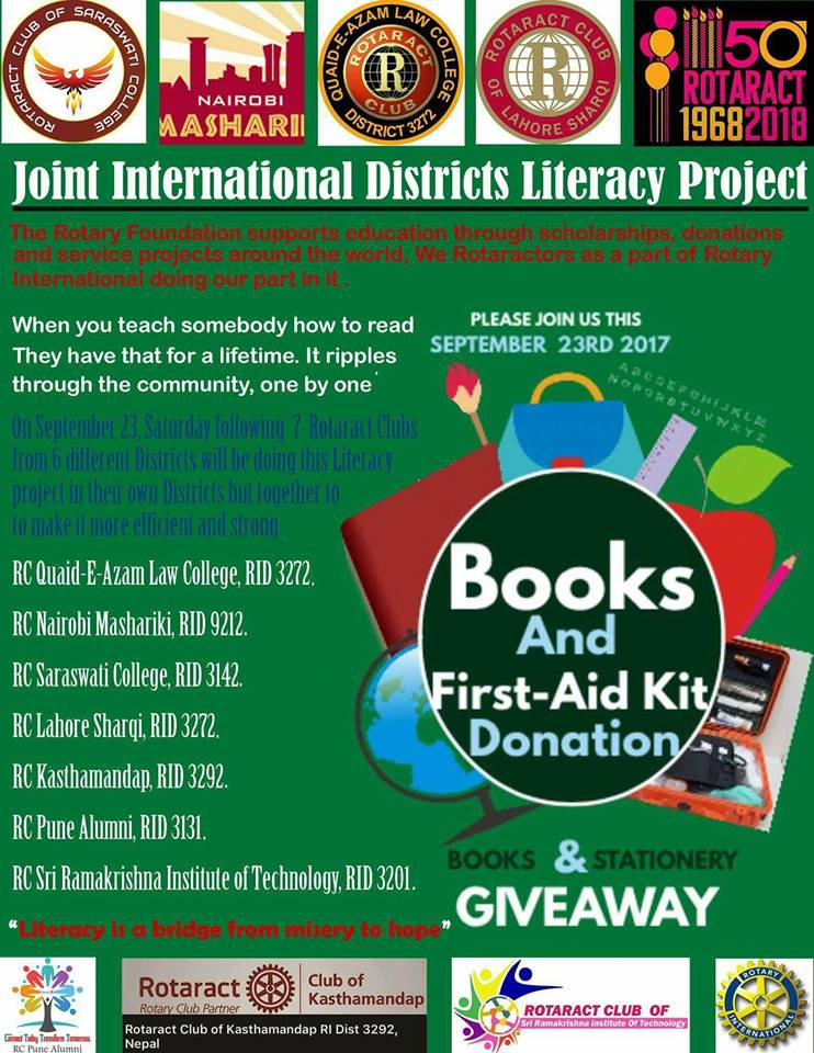 This was our first mega international project. We give First aid kit and motivatonal talk for the Government School students who are studying in Government union Middle School, Kalampalayam. International clubs Participated in this project are Rac pune alumni-RID 3131, Rac kasthamandap-RID 3292, Rac Lahore Sharqi-RID 3272, Rac Sarawathi college-RID 3142, Rac Nairobi Mashariki-RID 9212, Rac Quaid-E-Azam law college-RID 3272.