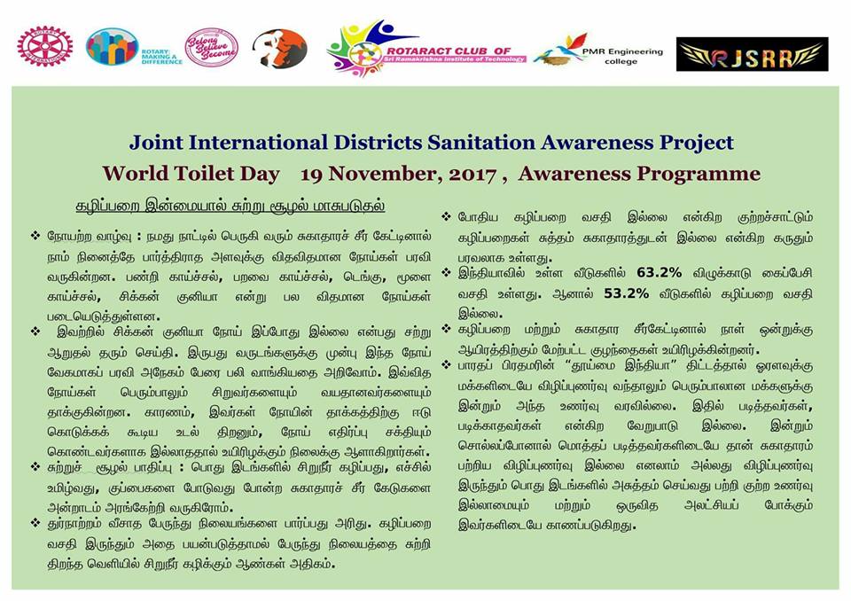 World toilet day is a day to raise awareness and inspire action to tackle the global sanitation crisis. The Rotaract club of Sri Ramakrishna Institute of Technology, Spons: The Rotary Club of Coimbatore Legends planned to create an awareness in 24 Villages in Coimbatore South Taluk on World Toilet Day 19.11.2017 on Sanitation and importance of Toilets in houses. This project has been initiated jointly with Rotaract club of Ambattur and Rotaract club of PMR Engineering College as International Service.